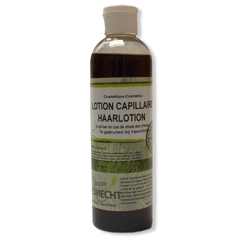 Artium lappa extract, Achillea millefolium extract, Juglans regia leaf extract, Urtica dioica leaf extract, Urtica dioica root extract, Cinchona officinalis extract, Alcohol, Aqua, Rosmarinus officinalis oil, Citris aurantium bergamia oil, Castor oil, Linalol*, Geraniol*, Citral*. *:Due tu natural essential oils